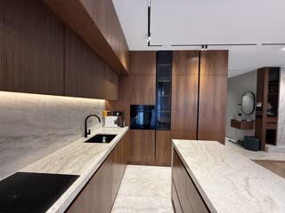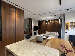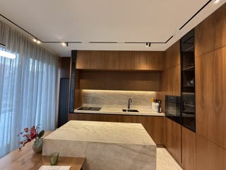 Она состоит из просторной гостиной, соединённой со столовой и кухней, отделанной мрамором и массивом дерева, что придаёт помещению дополнительную теплоту и элегантность.