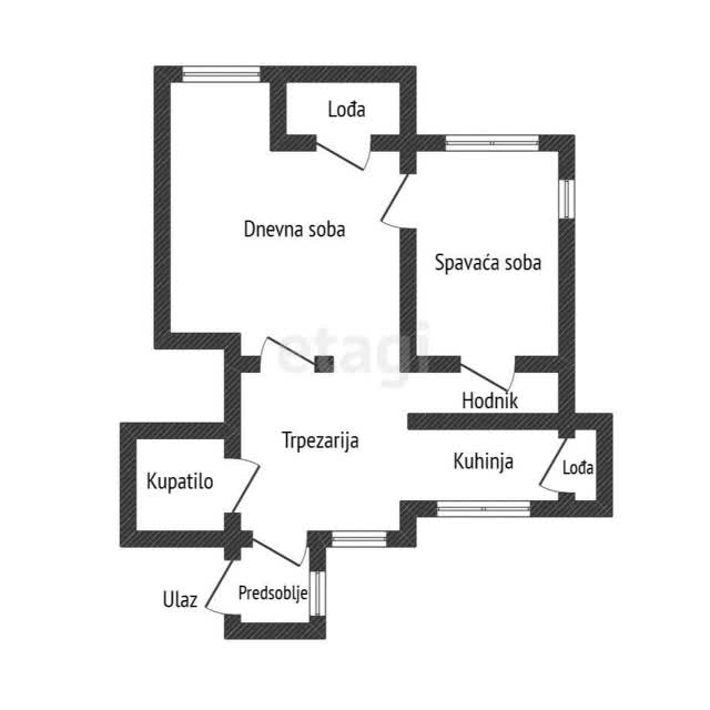 Stan se sastoji od ulaznog predsoblja, odvojene trpezarije, odvojene kuhinje, dnevne sobe, spavaće sobe, kupatila, hodnika i dve lođe (obe zastakljene).